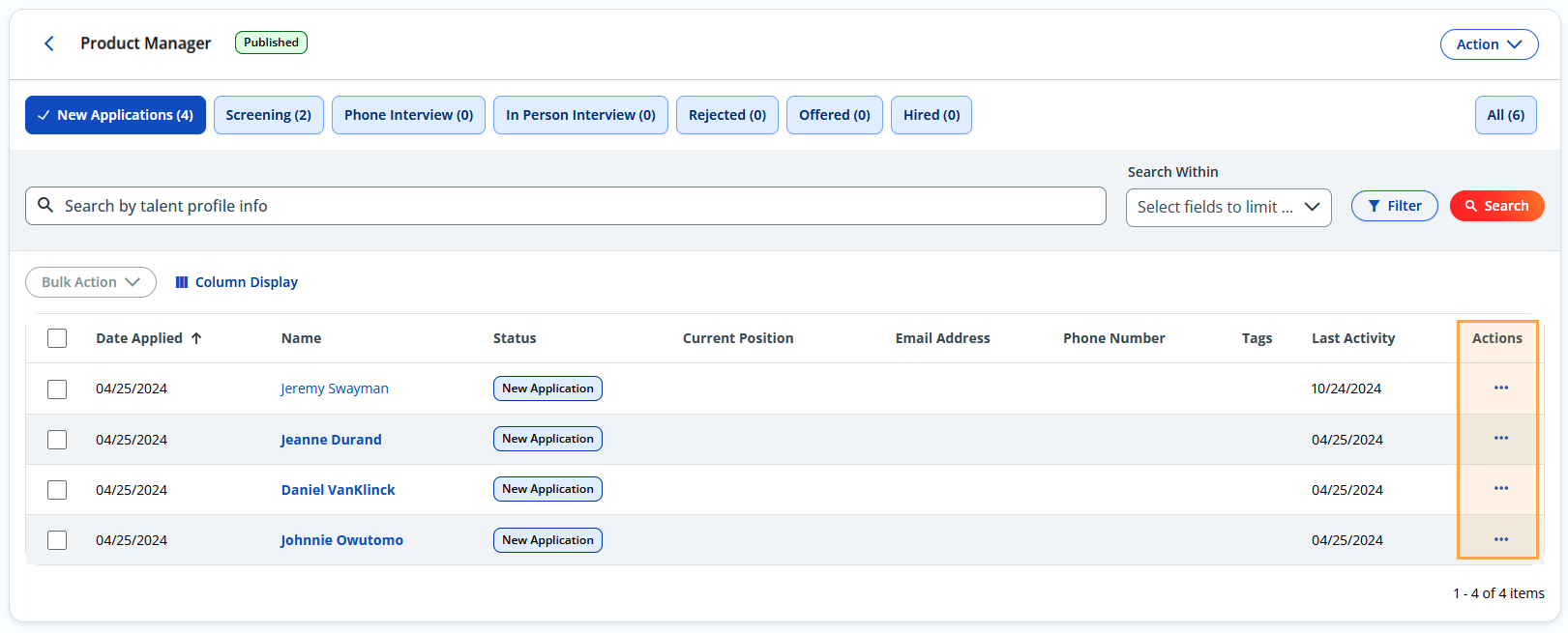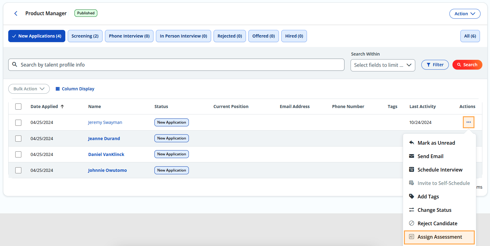 - On the Candidate List table, look under the Actions column and click the three dots beside one of the candidates.