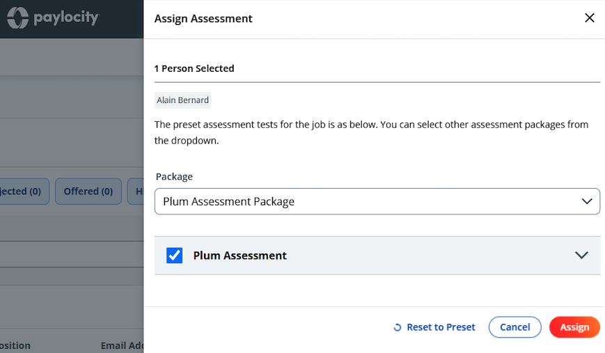 - Click the Assign Assessment option that appears in the menu, choose the Plum Assessment Package, and tick the Plum Assessment checkbox. Complete the process by clicking the Assign button.