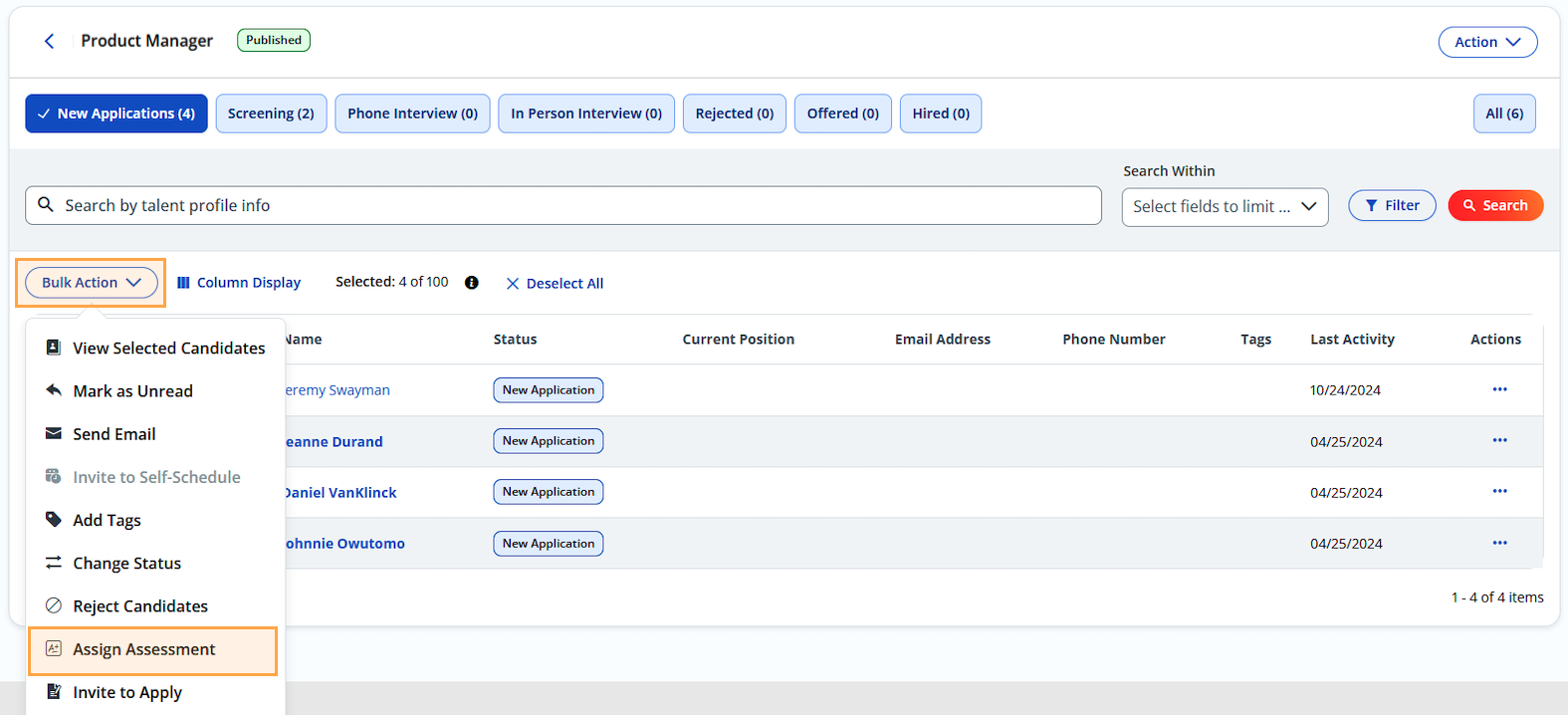 - Alternatively, to perform a bulk action, select multiple candidates on the Candidate List table by checking the checkboxes to the left of their names. Click on the Bulk Action button just above the checkboxes, then click the Assign Assessment option that appears in the menu, choose the Plum Assessment Package, and tick the Plum Assessment checkbox. Complete the process by clicking the Assign button.
