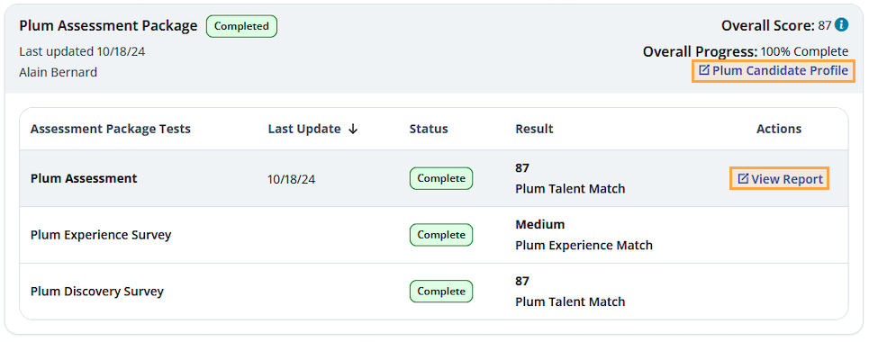 - To view a candidate’s Plum Profile within Plum, you can either click on the Plum Candidate Profile link or the View Report link.