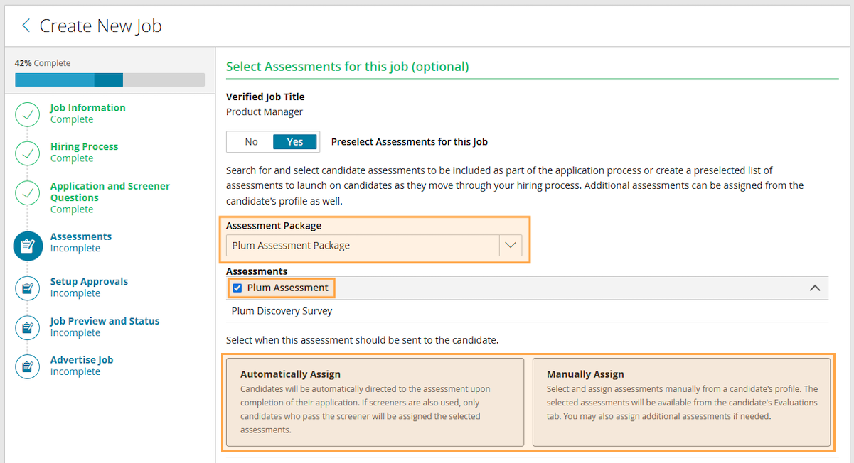 - Select the Plum Assessment Package, and make sure the Plum Assessment checkbox is ticked. Then determine whether you want to Automatically Assign the assessment for all applicants to the job, or if you would rather Manually Assign the assessment to individual candidates on a one-by-one basis.
