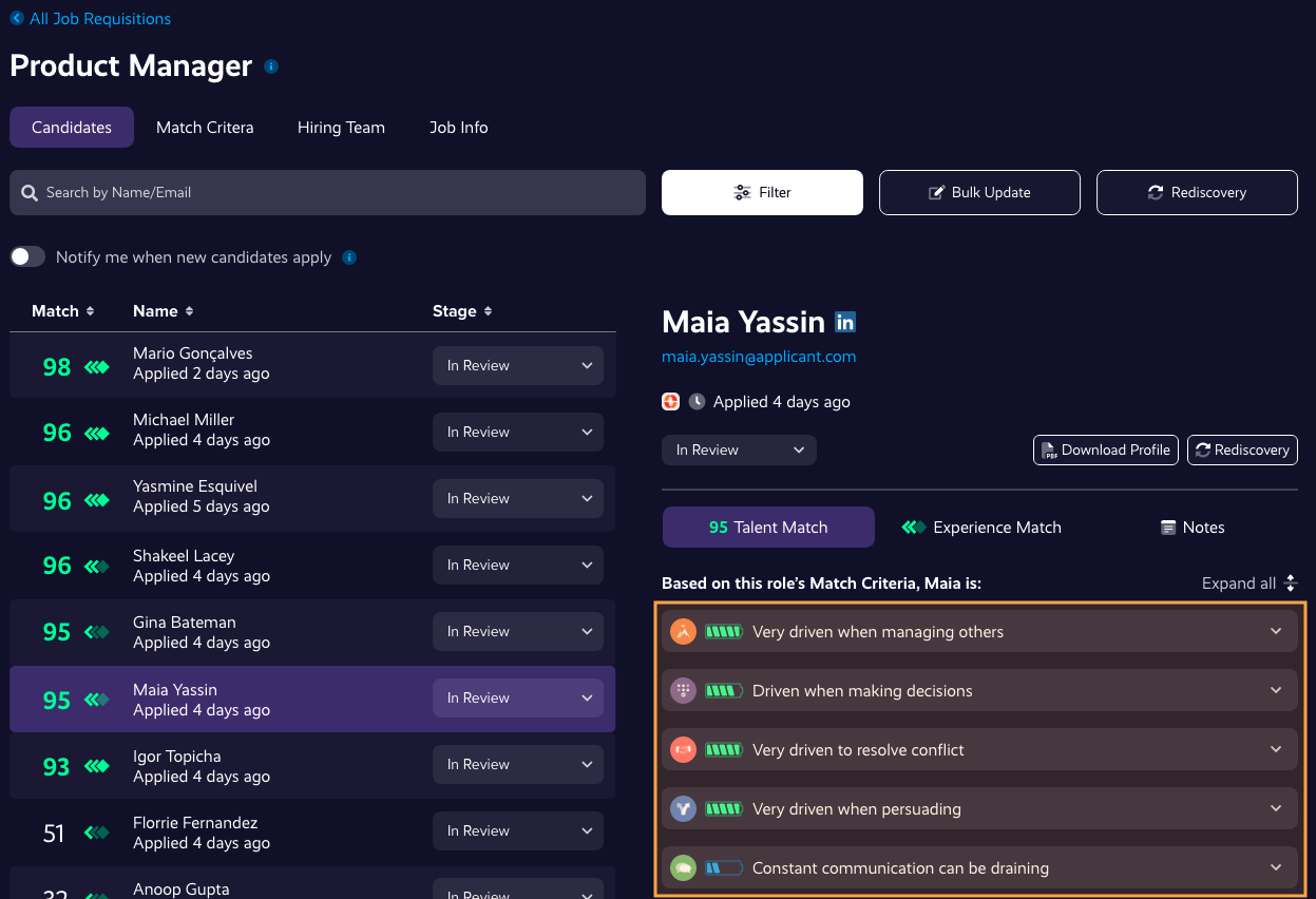 Once you've set up Match Criteria, all current and future candidates will receive a Talent Match.