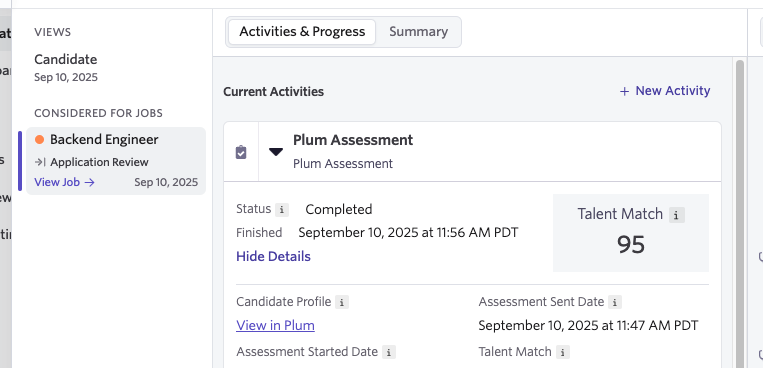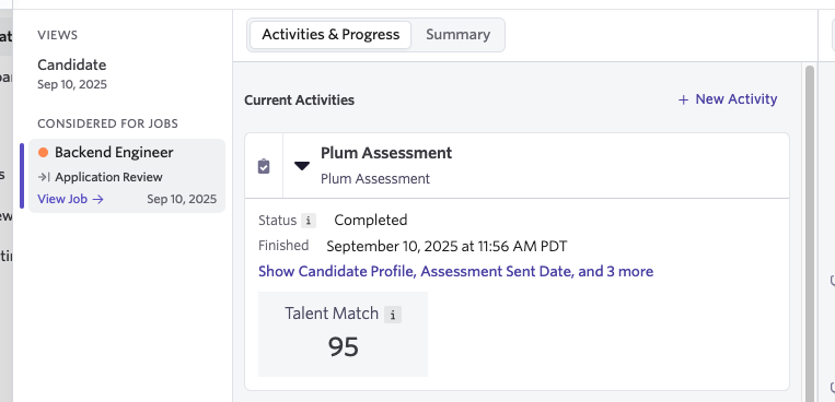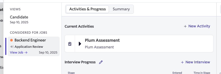 - Go to the Candidate Pipeline and navigate to the pipeline stage that includes the Plum Assessment as an Activity.